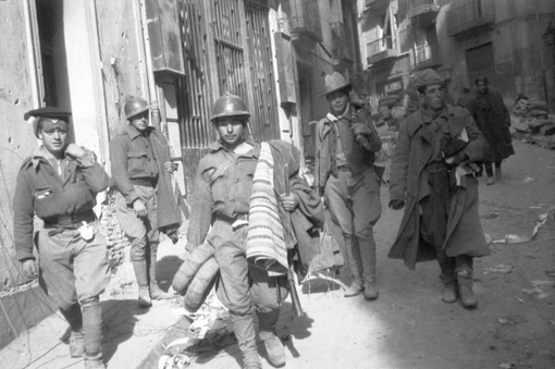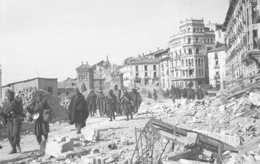 L’entrée des franquistes dans la ville, après le départ des républicains. Décor et ambiance d’opéra, Luciano Pavarotti. Une atmosphère lugubre après la tuerie et la destruction que nous allons voir dans les billets suivants. Il se promènent dans la rue qui mène à la Plaza del Torico.