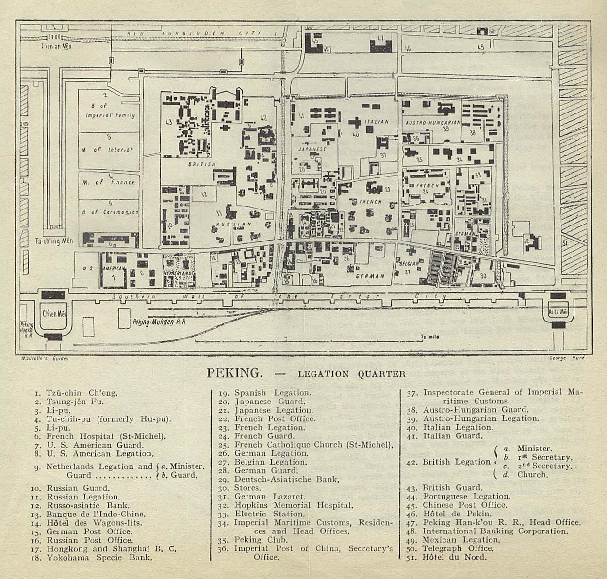 * Notes du traducteur : Des recherches du traducteur de russe bien connu, Jan Paul Hinrichs, in consultation avec le poète russe Valery Pereleshin (pseudonyme de Valery Frantsevich Salatko-Petrishche, 1913 – 1992), ont démontré que la maison dont parle Terborgh était inspirée par l’ancienne Légation austro-hongroise dans le quartier des Légations, nr 39 sur la carte au-dessus de cet article, à droite en haut, habitée par la veuve du Général D.L. Chorvat, ancien directeur des Chemins de fer de Mandchourie. Ref. « Terborgh, Pereleshin en een huis in Peking » (het Oog in’t Zeil, décembre 1985),