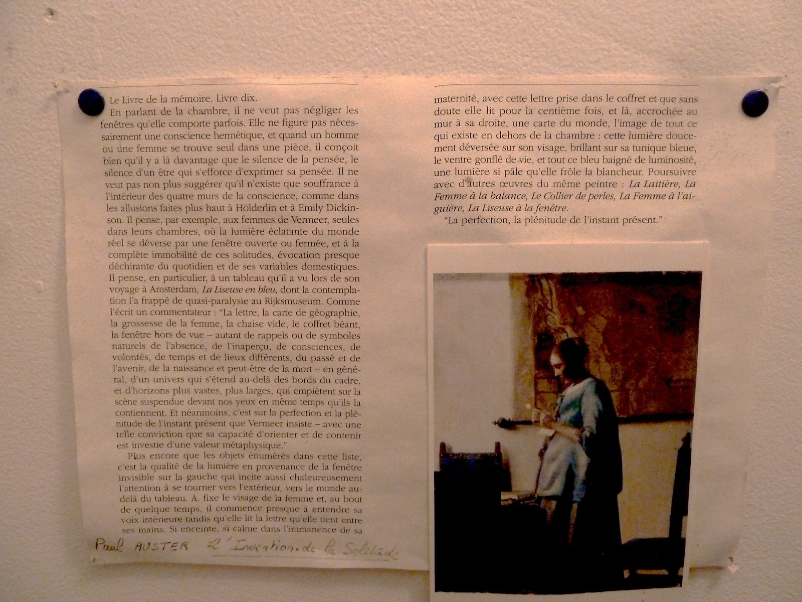 Quelques minutes plus tard, un courriel de Christine atterrit comme un goéland sur mon bureau d’iMac: “Cher Jan, je viens de lire ton texte sur la peinture de Vermeer puis celui d’Anna que j’ai trouvé vraiment très beaux tous les deux. Ça m’a fait penser à un texte de Paul Auster que j’ai lu il y a une vingtaine d’années, “L’Invention de la solitude” (le meilleur selon moi de l’écrivain américain) et j’avais punaisé la carte avec cet extrait que j’aimerais faire parvenir à Anna. Pourrais-tu le faire pour moi (je n’ai pas son e-mail)?
