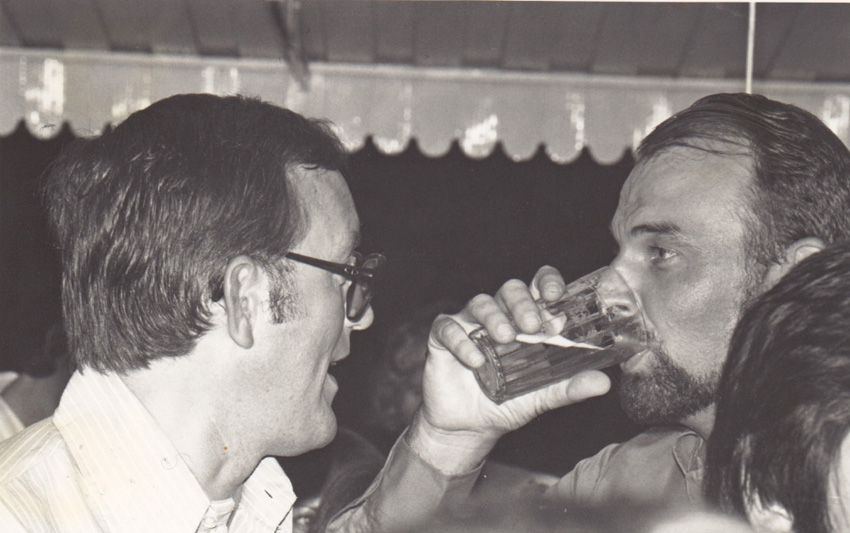 Bientôt, lui et moi devinmes très actifs dans un combo de jazz et, surtout, sur scène, en écrivant des textes et mélodies pour les revues. Aller était inépuisable. Nous avons organisé, par exemple, une fête ‘Mafia’ basée sur le film ‘Some like it hot’. Les hôtes entraient dans ma maison dans le séjour converti , comme dans le film, en pompes funèbres. Au milieu un vrai cercueil, avec un vrai corps (‘dormant’, une bouteille de genièvre et un verre à côté pour réanimer le défunt). Au pied du cercueil un orgue, joué solennellement par Truus, lourdement voilée. Les arrivées payaient leur respect au ‘mort’ avant d’entrer dans le ‘speak-easy’ (bar clandestin) où on servait le whiskey en tasse à thé.