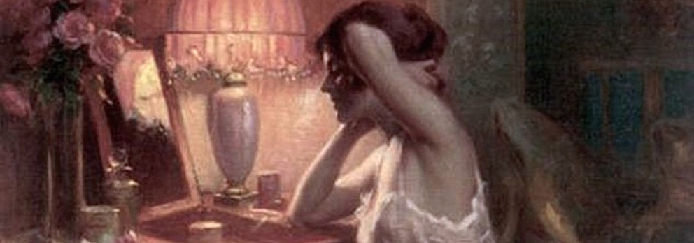 femme assise devant son miroir à songer. je distingue, derrière une petite balle laiteuse de coton qui reste tenue en l’air, tenue négligemment, un visage en reflet. à peine. le soir tombant rend la vision légèrement plus aiguë, l’œil peut courir directement à sa cible sans se perdre en route, selon une trajectoire de flèche, de main dans le sac. cela me semble se passer très loin et magnétique, une sorte d’enclave, un cyclone. mais je peux percevoir ce regard qui reste crypté, suspendu, horizontal. dépourvu d’humeurs, mais songeur à l’excès. c’est-à-dire d’une songerie sans objet, qui est juste un ralentissement maximal, perfectionné. qui fige le regardeur que je suis. il y a comme un duel de lenteur. elle ne peut pas me voir. cette main suspendue a tout oublié. la position assise du corps n’est pas tout à fait confortable, plutôt désarticulée, position d’oubli également, plutôt que d’abandon. c’est une sorte de scène de cabaret, une loge, fermée aux regards. seuls ceux passant par la fenêtre. elle tient le beau en respect, la grâce à distance.