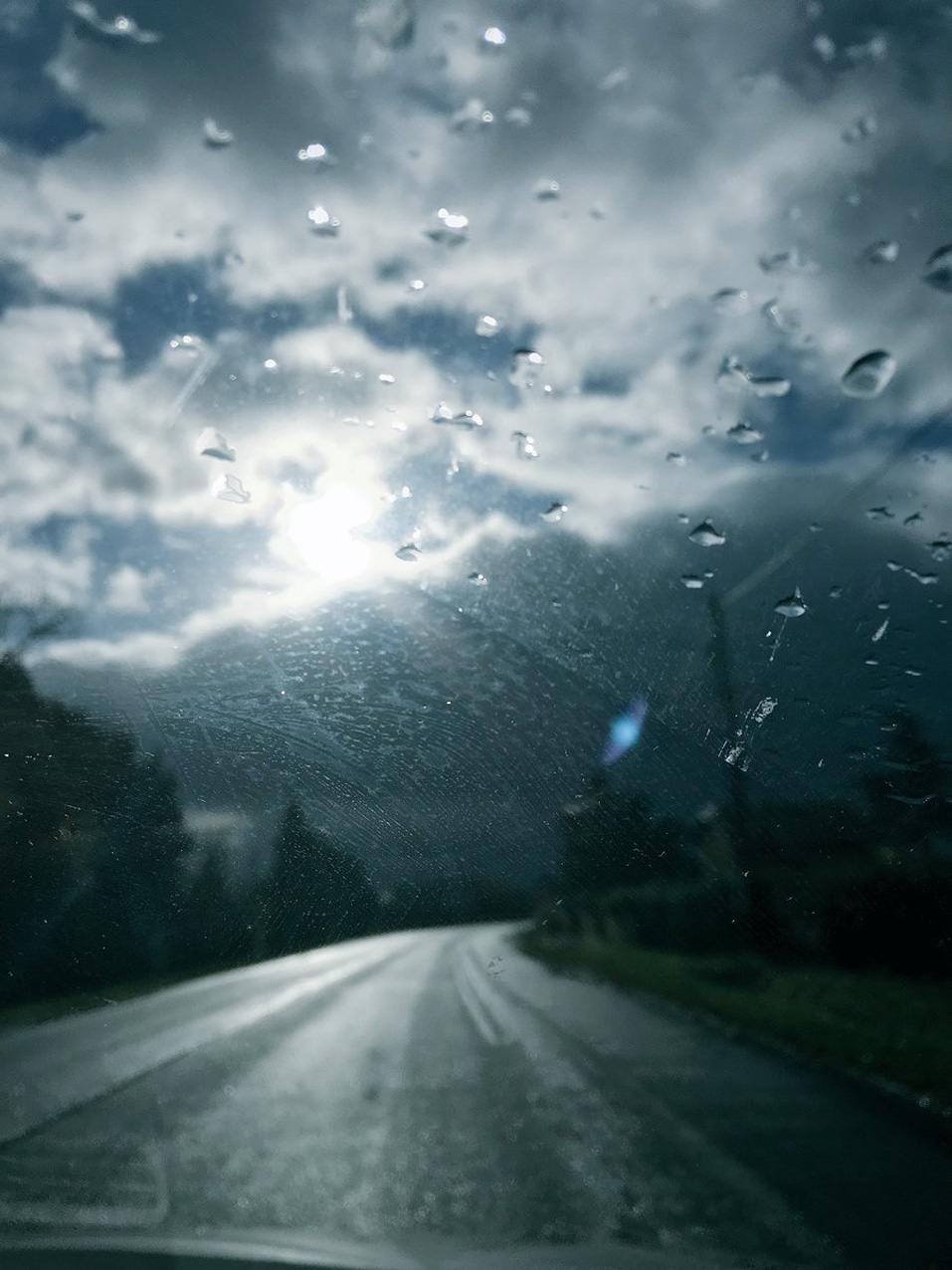 Un sanglot lui échappe. Elle va mourir sur cette route. Pourtant le ciel est si beau, mariant nuages, pluie et soleil dans un bal resplendissant de lumière.