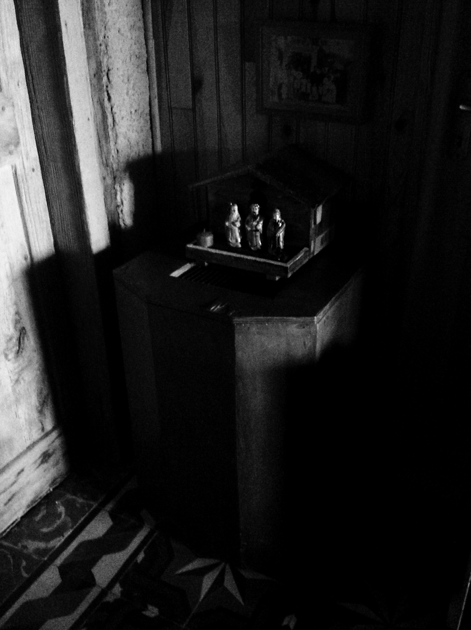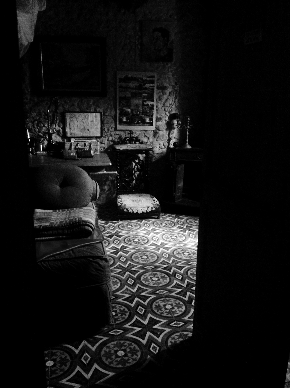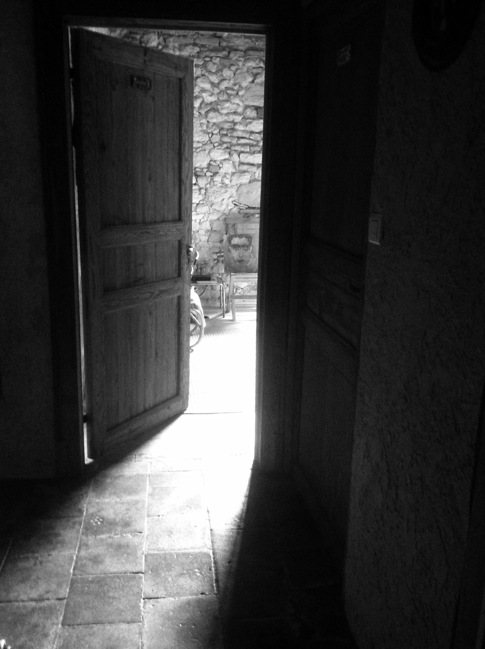Volets clos. M. longe les murs de pierres, éclairé à l’écran du téléphone comme à la torche dans une grotte. M. est une silhouette qui marche… ou seulement une ombre qui ne suit plus personne… ou l’homme de toute ombre disparue dans le noir, quand la mèche s’éteint.