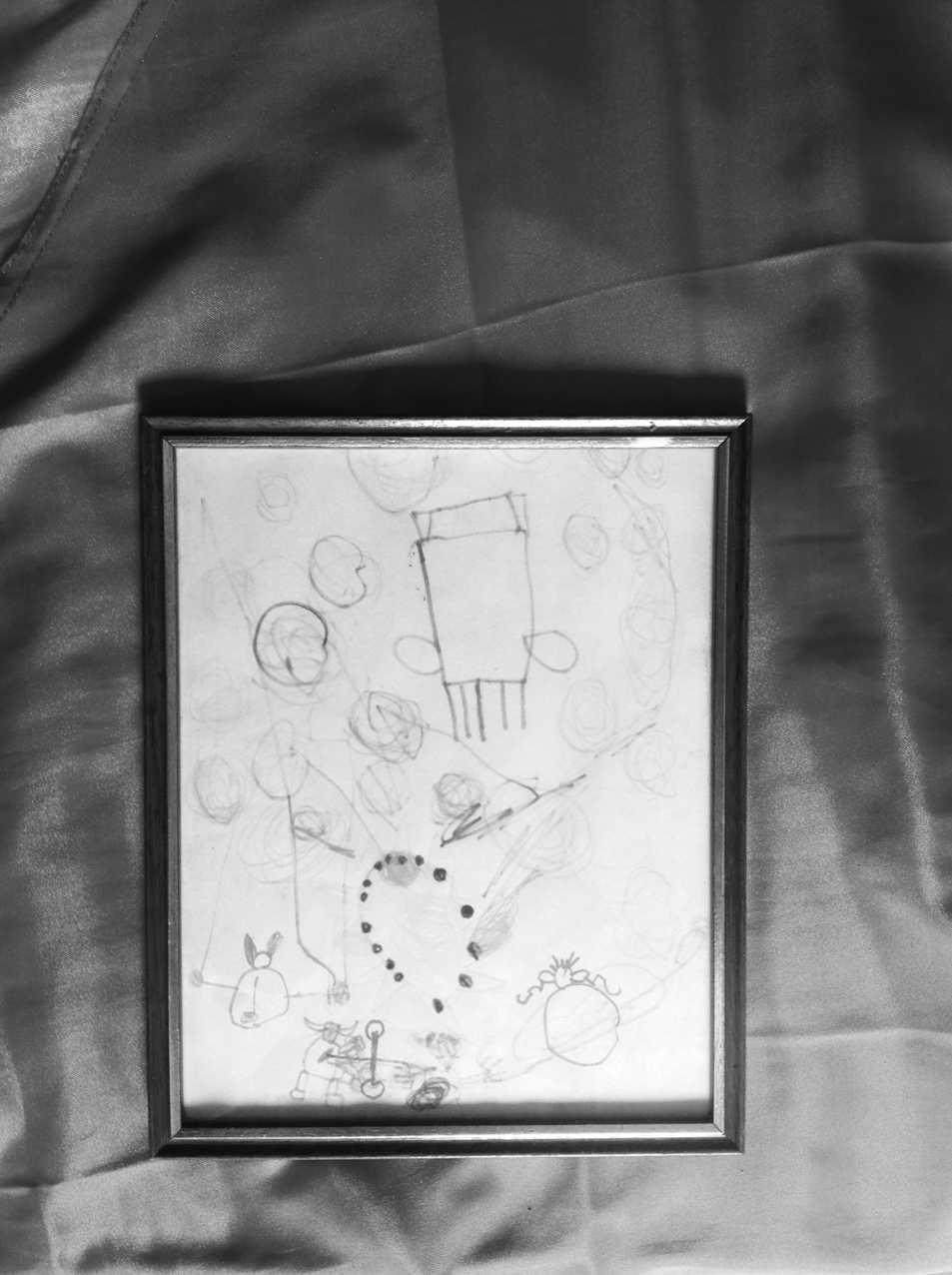Le vent se lève. Le bruissement dans les arbres ressemble à des messes basses chuchotées à l’oreille. Il fait noir. Plus sombre qu’au rez-de-chaussée. Le toit est bas comme les nuages dans le ciel orageux. En baissant la tête pour ne pas se cogner, M. se souvient avoir un jour été bien plus petit que la grande faux posée là. L’enfant mort qui l’habite regarde les dessins qu’il ne sait plus faire. M. reconnait quelque-chose de familier dans le mouvement du gribouillage, sa maladresse, quand il signe un papier au travail, note une adresse sur un pense-bête, son trait tremblant de gaucher contrarié par son écriture.