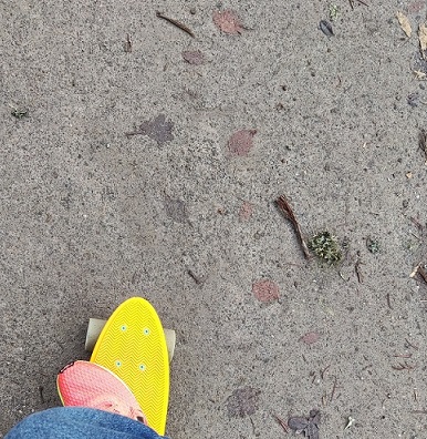 Pas besoin de confort. Planche à roulettes m’accompagne à la ville comme à la campagne. Sous le soleil, par grand vent, même sous la pluie, dans la forêt, sur feuilles mortes -petits cailloux – épines de pin, quasi dans la gadoue, sur les trottoirs, l’asphalte ou bien même sur du carrelage. En k-way, en jogging, en short, en costume trois pièces, avec ou sans protections, avec ou sans lunettes de soleil, avec ou sans sac à dos, avec ou sans chaussures qui adhèrent, et même pieds nus parfois. En lisant mes mails, en filmant ou tout en prenant des photos, en m’cassant la gueule ou pas, en écoutant du Dixieland ou du Krautrock, en étant sobre ou gentiment défoncé, de jour comme de nuit, avec ou sans lampe frontale. Dans n’importe quelle rue, sur des routes abîmées ou lisses, dans l’ordre ou dans le désordre, tricks ratés ou réussis, j’m’en fiche.