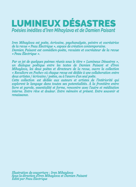 Lumineux désastres, poésies inédites d’Iren Mihaylova et de Damien Paisant, premier livre de la collection « Revulivres en poche », Peau Électrique Revue, 2024 : https://peaueleclabo.wixsite.com/revue
