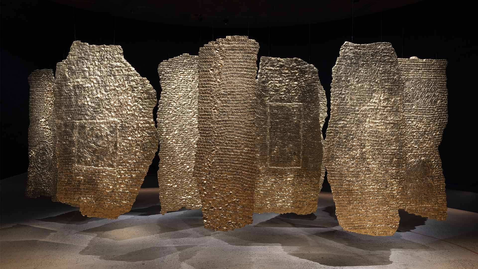 L’installation Estelas (2007) d’Olga de Amaral, présentée dans l’exposition « Olga de Amaral » à la Fondation Cartier, Paris, 2024 © Marc Domage