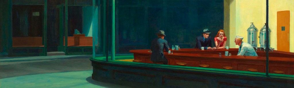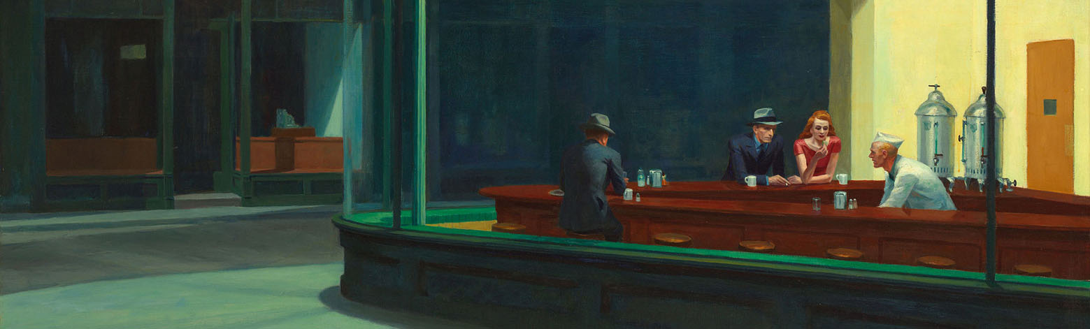 Edward Hopper est souvent décrit comme le peintre de la solitude, de la mélancolie, et c’est sans doute vrai mais, loin d’être seulement nostalgique (et encore moins décoratif) il sait investir des territoires autrement plus centraux, et dangereux. L’énergie est violente sous le calme apparent des constructions, avec ces couleurs froides qu’il affectionne. Ce sont ces lieux que je tente de rejoindre ici.